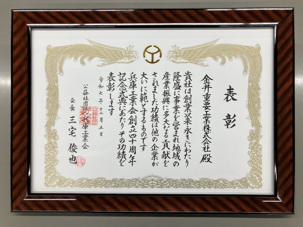 金井重要工業は12月5日、神戸ポートピアホテルで行われた兵庫工業会40周年記念式典にて「長寿企業」として表彰されました。